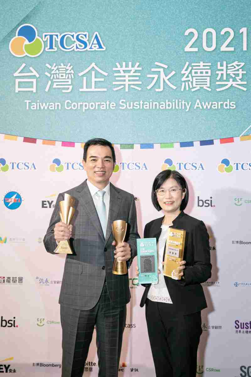 达在台湾永续奖所评比环境、、社会、、治理等各面向的永续绩效均获高度肯定 (左:MG电玩光电总经理暨营运长柯富仁,,右:MG电玩光电永续长古秀华)