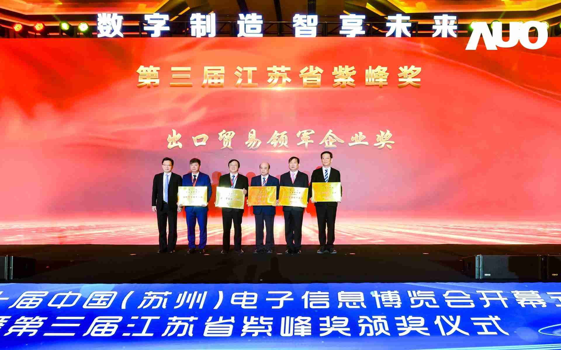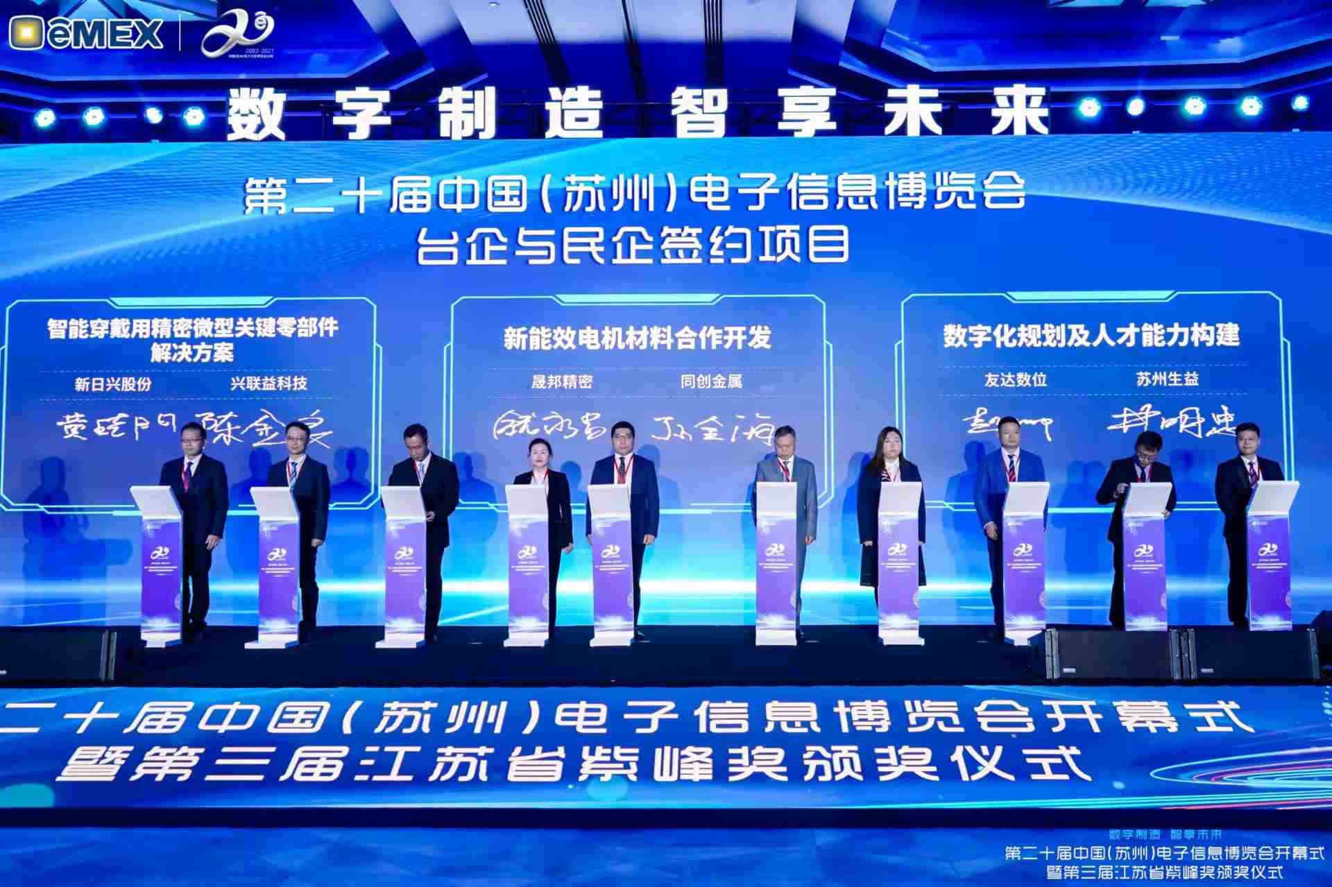 电博会开幕式当天也是第三届江苏省紫峰奖颁奖仪式,,,,省台办、、、工信厅、、、商务厅、、苏州市相关领导均出席并颁奖。。该奖项为表彰对江苏高质量发展做出积极贡献的在苏企业,,由江苏省政府专门设立。。。。MG电玩光电 (苏州) 总经理郭振明代表上台领奖,,,这也是MG电玩苏州连续三次蝉联紫峰奖 出口贸易领军企业奖。。。MG电玩数位总经理赵丽娜女士,,也参与本次开幕式,,,上台为本地化赋能签署战略合作协议,,,将优质服务资源集合、、下沉到更多细分行业,,为更多地区的制造企业提供数字化转型服务。。。