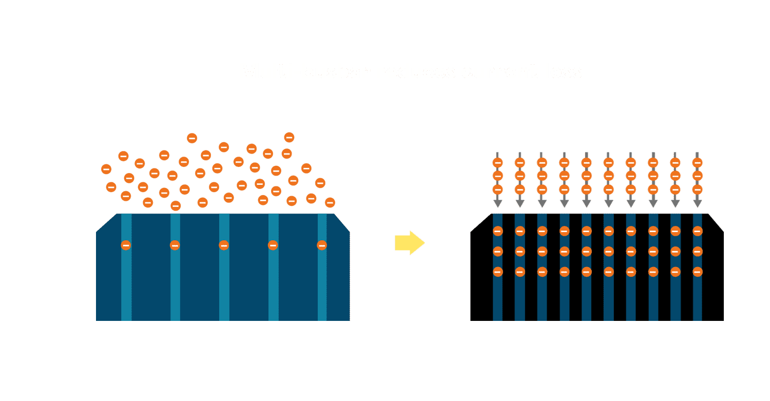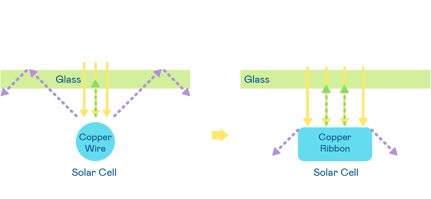 • 电池使用多条铜导线 (Copper wire) 于电池片上形成较短的电流路径,,提高电流收集效率,,,采用圆形设计的铜导线较传统扁平式的铜焊带 (Ribbon),,,可增加入射至电池的光线量。。。。