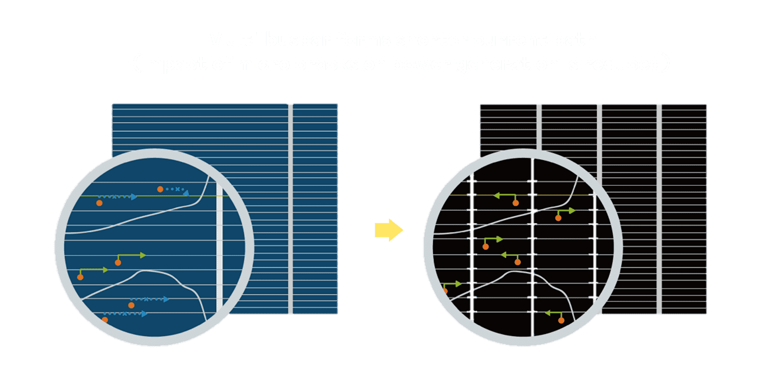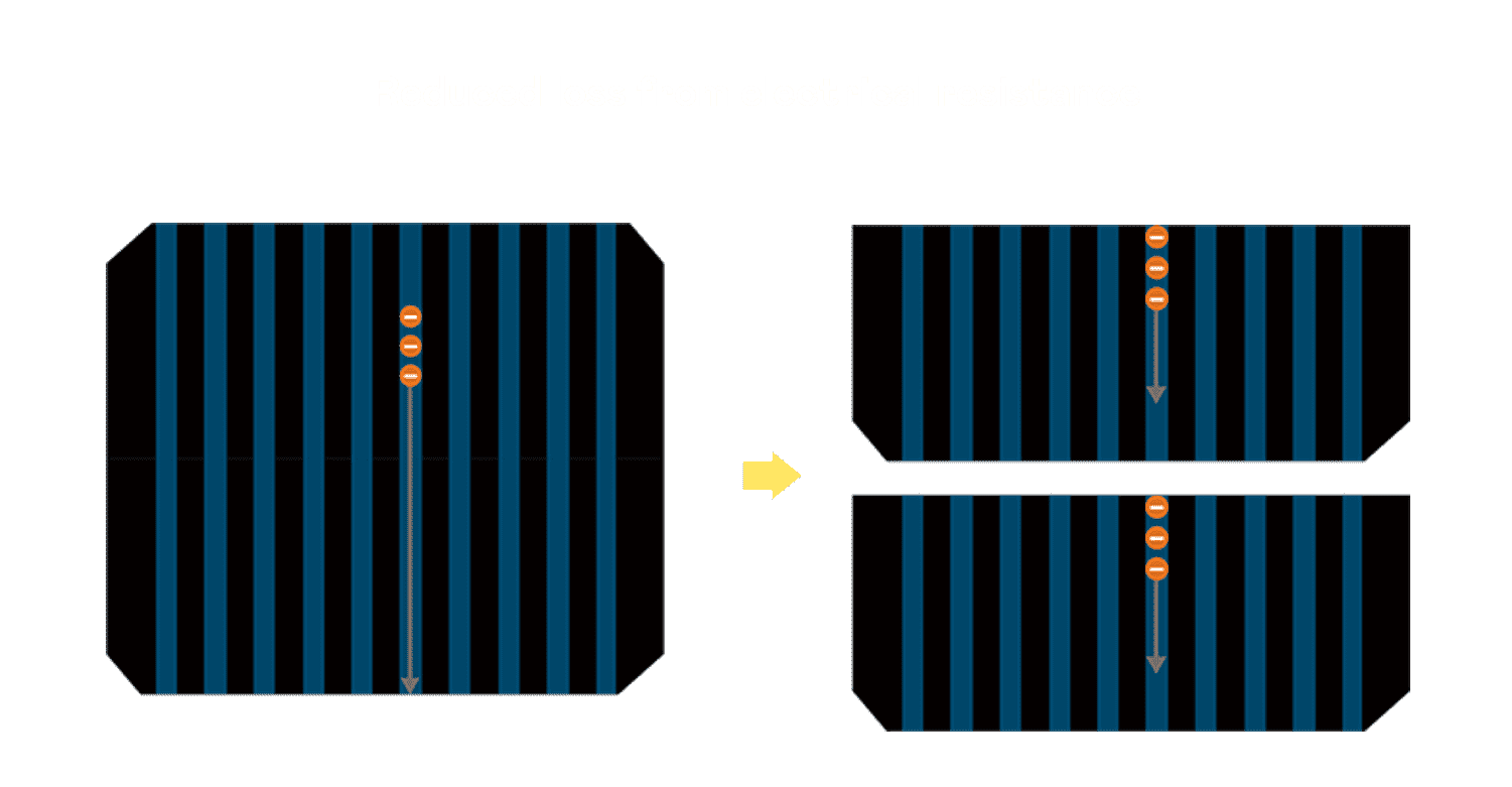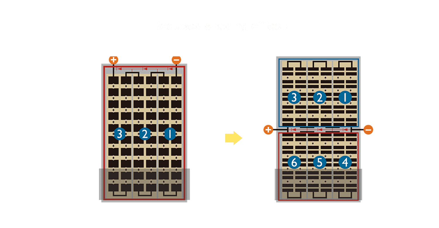 • 结合半切电池,,,,降低遮阴影响、、、提升模组抗隐裂能力、、、并减少电阻损耗,,,,进一步提升模组发电效能。。